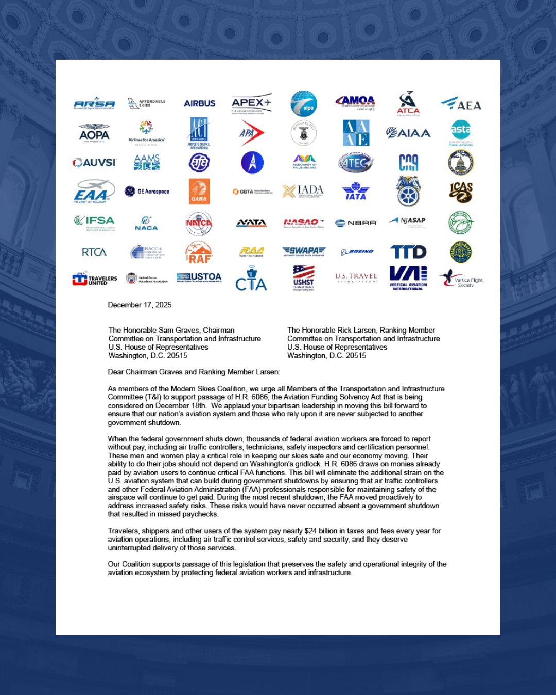 AFA and the Modern Skies Coalition – made up of representatives from the entire aviation industry – sent a letter to the House Transportation and Infrastructure Committee urging support for the Aviation Funding Solvency Act. This legislation would ensure that federal aviation workers, like Air Traffic Controllers, TSA Officers, safety inspectors, and others, are paid during a government shutdown.